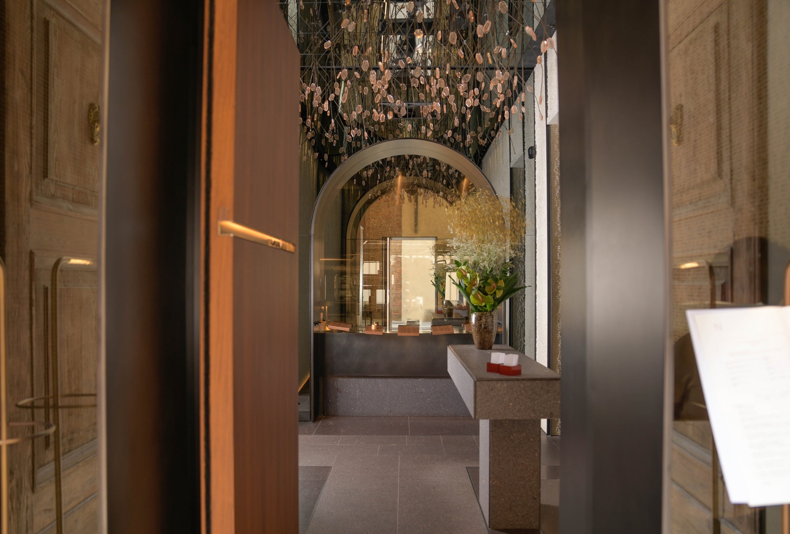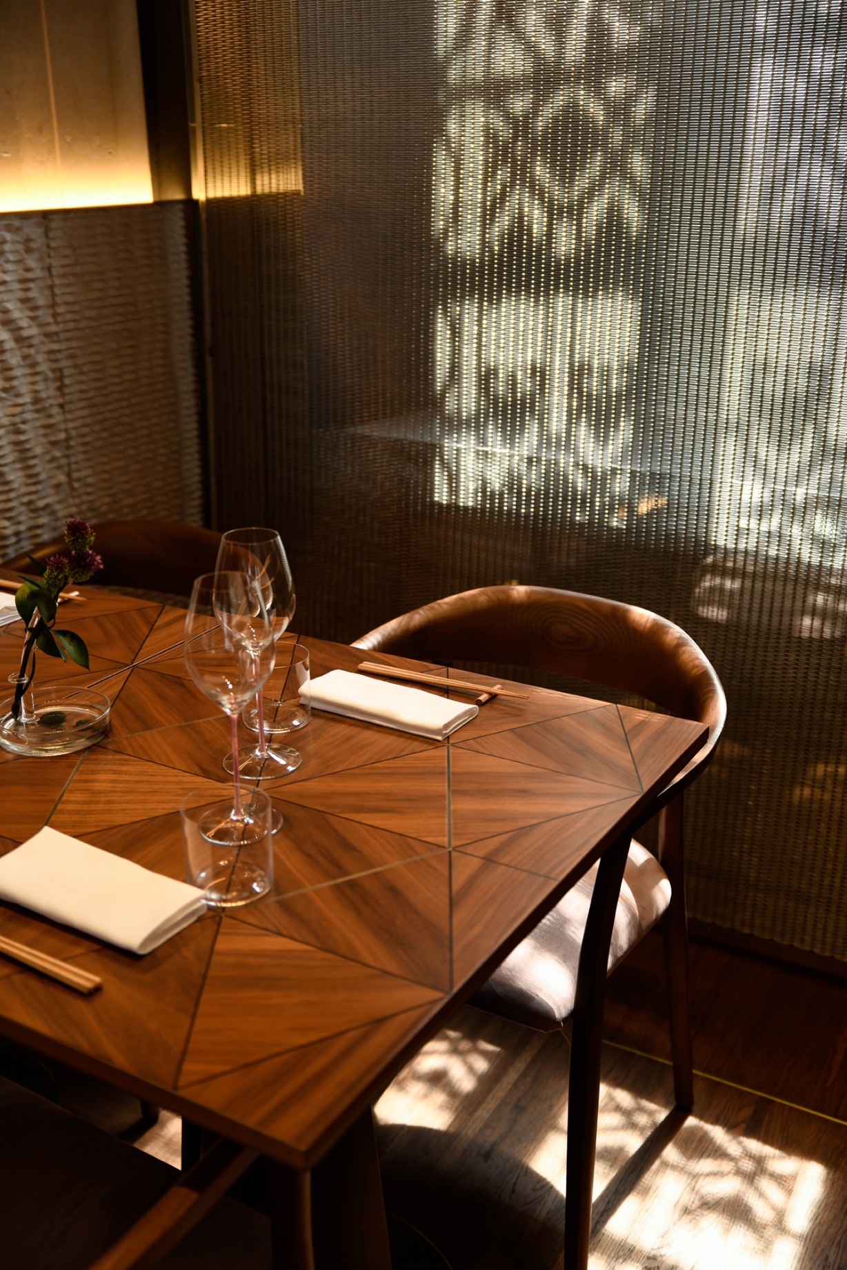 Gli esagoni che ricorrono nei tavoli e nei dettagli omaggiano Yushima, il quartiere di Tokyo dove è nato lo chef, mentre la foglia di canapa, simbolo di crescita e prosperità, decora discretamente le superfici lignee.